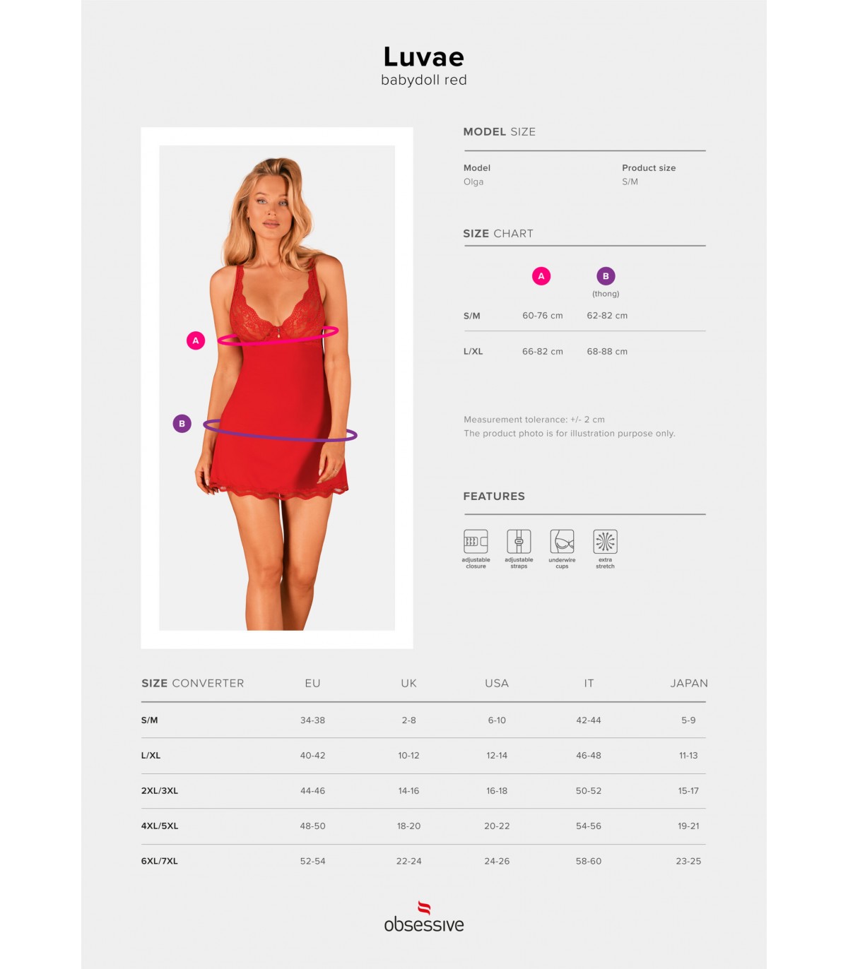 Il babydoll Luvae dona sensualità e fascino grazie al suo splendido reggiseno e alla sexy schiena scoperta! Ora, le notti con il tuo partner saranno ancora più calde e fantastiche! Lasciati trasportare da questo tipo di piacere. Maggiori dettagli qui: – Babydoll Luvae in nero – Spalline decorative regolabili – comfort d’uso – Reggiseno con ferretto – look perfetto – Splendida perla tra gli occhiali – Chiusura regolabile sulla schiena – Il prodotto include: babydoll e perizoma abbinato – Materiali multistretch delicati e morbidi (85% poliammide, 15% elastan)