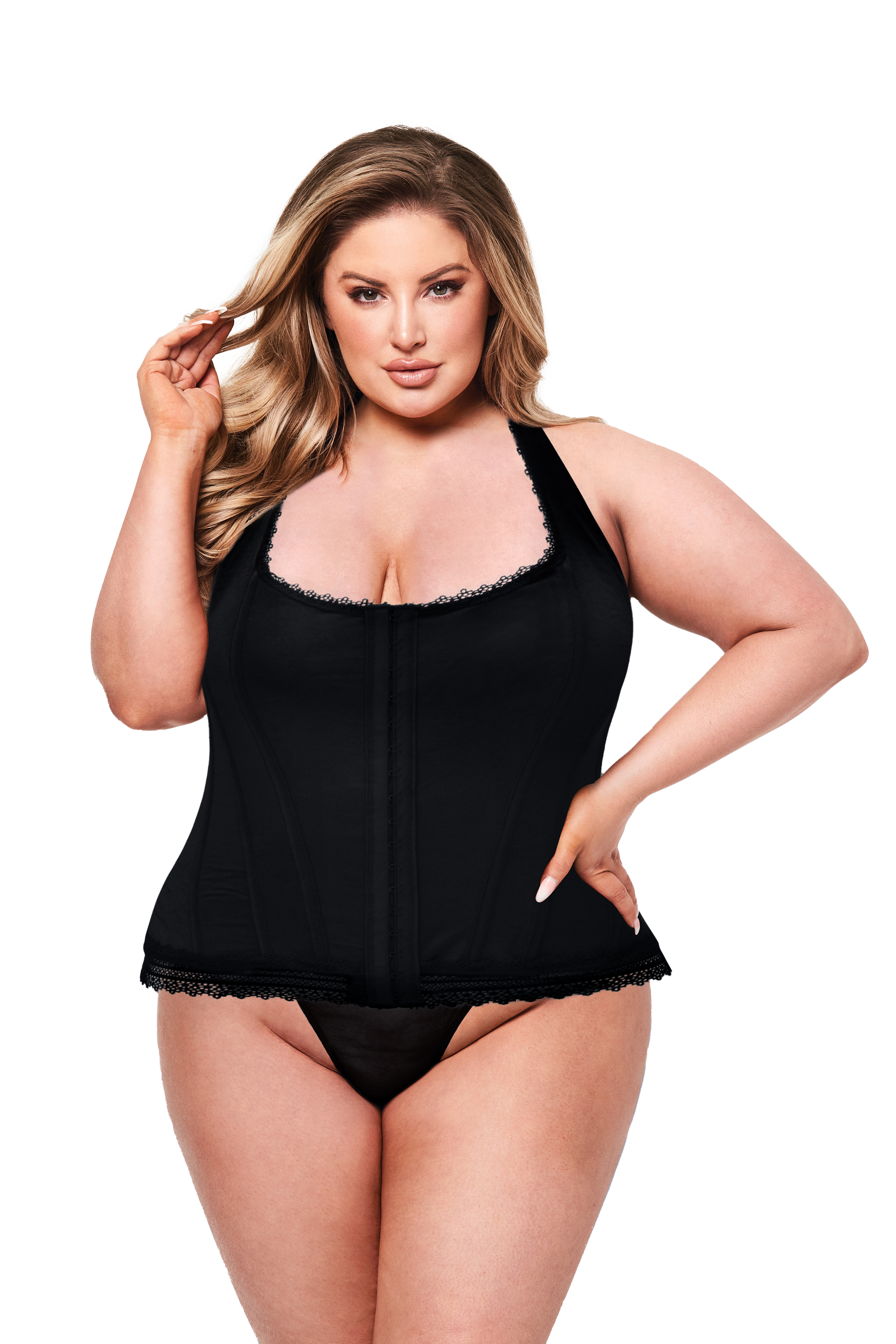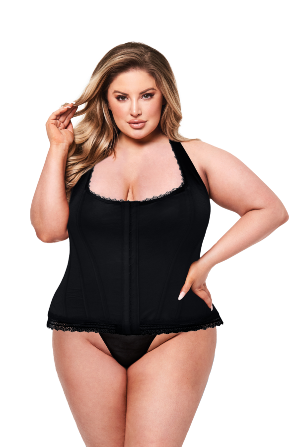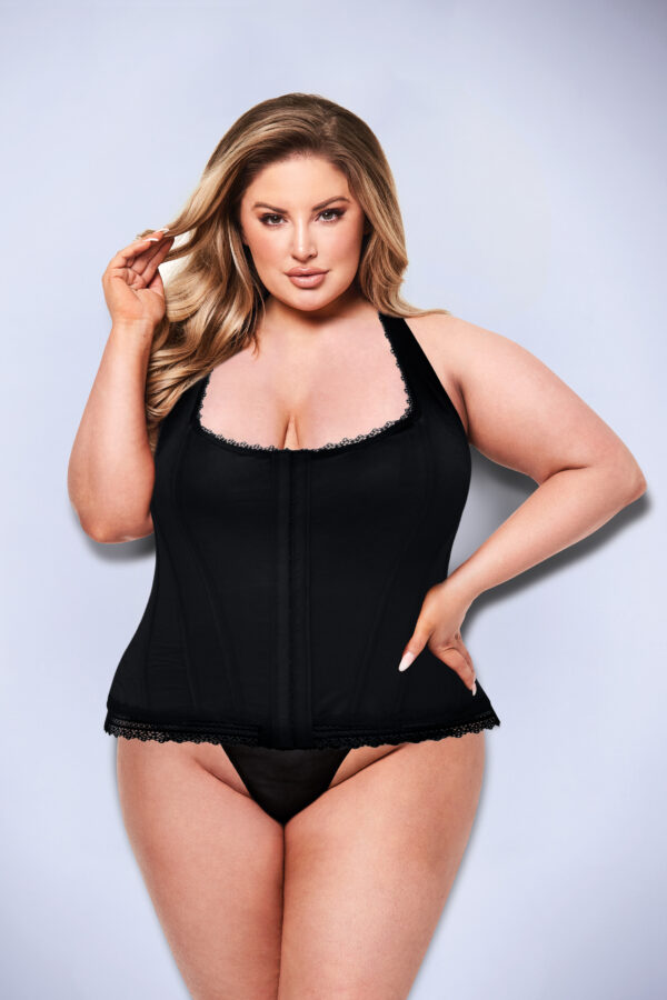 This corset from Baci exudes style and simplicity, with a hook & eye closure at the front & lace up ties on the back. And the edges of the corset are almost doily-like, showing off that extra sexiness!
