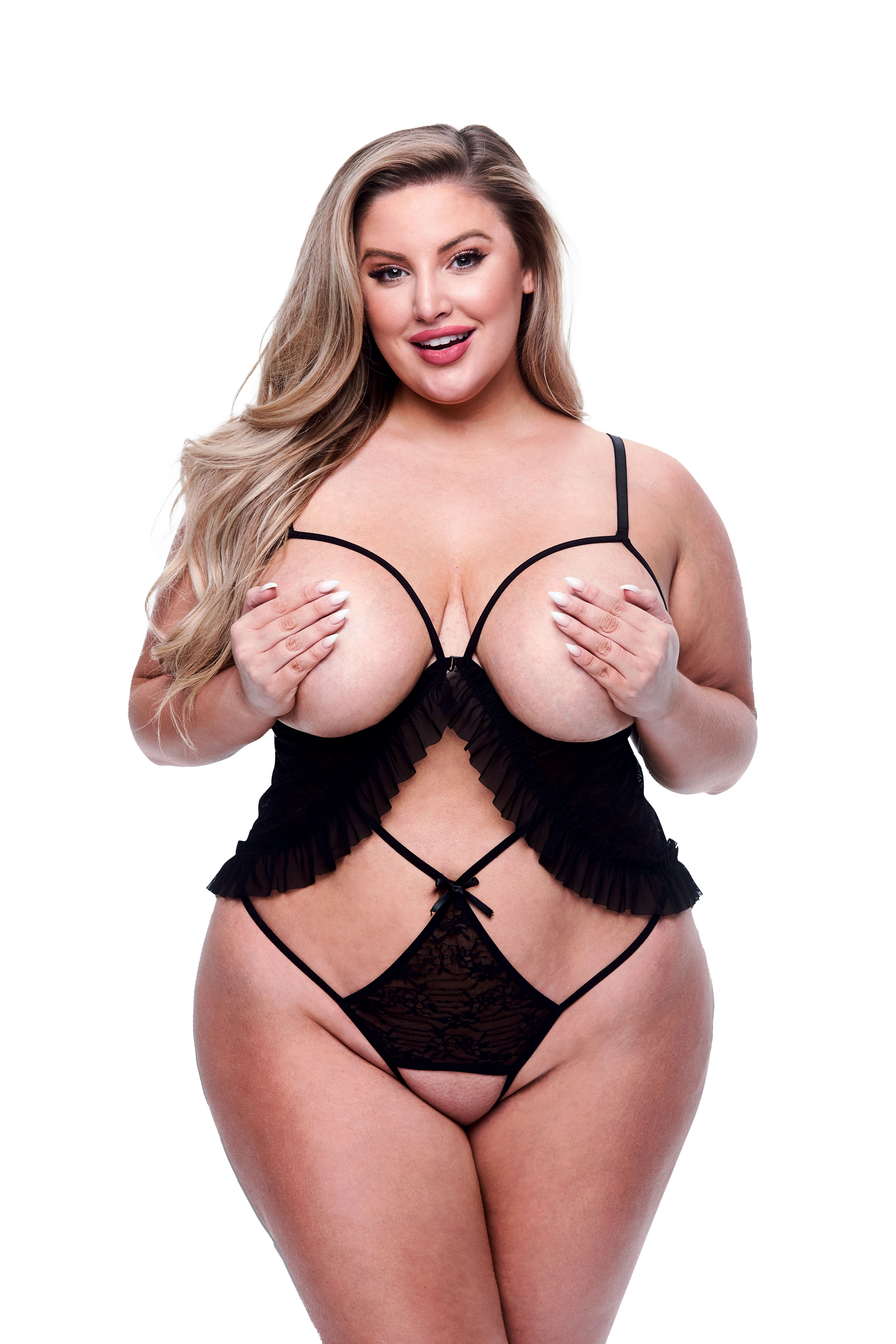 Dressed up or dressed down – however you choose, dress up YOU with Baci! Flirty and feisty pair together with this strappy teddy. The crisscrossed teddy features peek-a-boo open cups with a fluttery bodice designed in elegant sheer lace with a frilled hem, while the attached crotchless panty features dual strapping – one low on the hips, and one high along the torso.