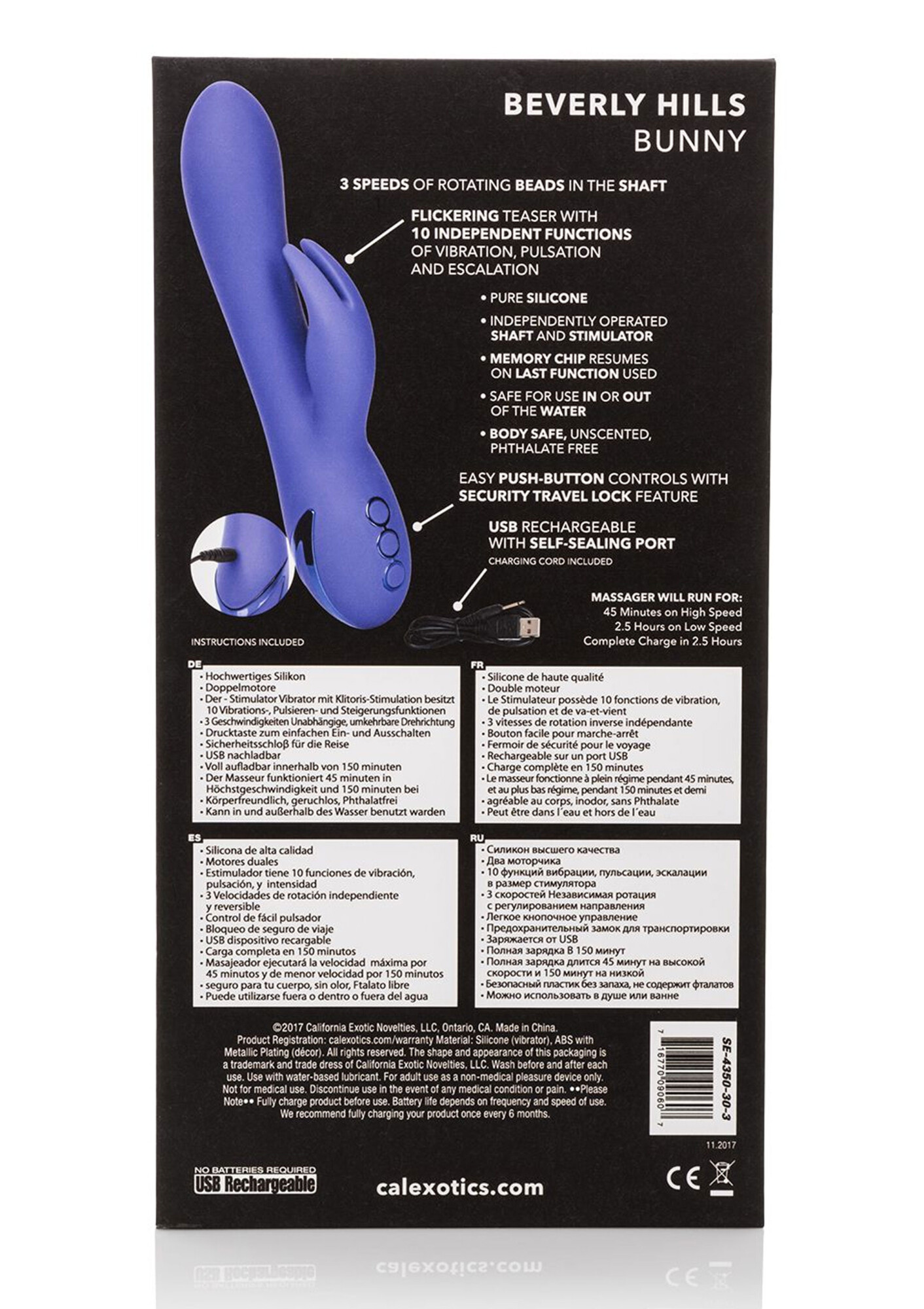 Dive deep into pools of pleasure and sun-kissed fantasies with the posh California Dreaming Beverly Hills Bunny. The luxurious vibrating massager has 10 intense vibration functions, 3 independent shaft rotation functions and a unique teaser with a sensual bunny teaser for one-of-a-kind pleasure experience. The seamless silicone body and flickering clitoral vibrator teaser put out knee-shaking stimulation in and out of the water.Whether you’re looking to turn up the heat with a lover or just enjoy some sensual solo time, this ravishing rabbit is ready. While contoured bunny teaser flickers and moves with your body, the 3 speeds of rotating beads in the shaft deliver thrilling g-spot massage. Control and customize your pleasure play with the independently controlled shaft rotation functions and teaser vibration functions. Recharge the massager in 2.5 hours with the provided USB charging cable to enjoy 45 minutes of high-speed stimulation or 2.5 hours of low speed vibrations. Enjoy frustration-free control with the easy-touch 3-button control pad and security lock feature for travel-ready teasing. The virtually seamless body and self-sealing charging port allow you to get this versatile waterproof vibrating massager for a dip. The hypoallergenic premium silicone is body safe, unscented and phthalate free to keep you most sensitive spots, happy and healthy.