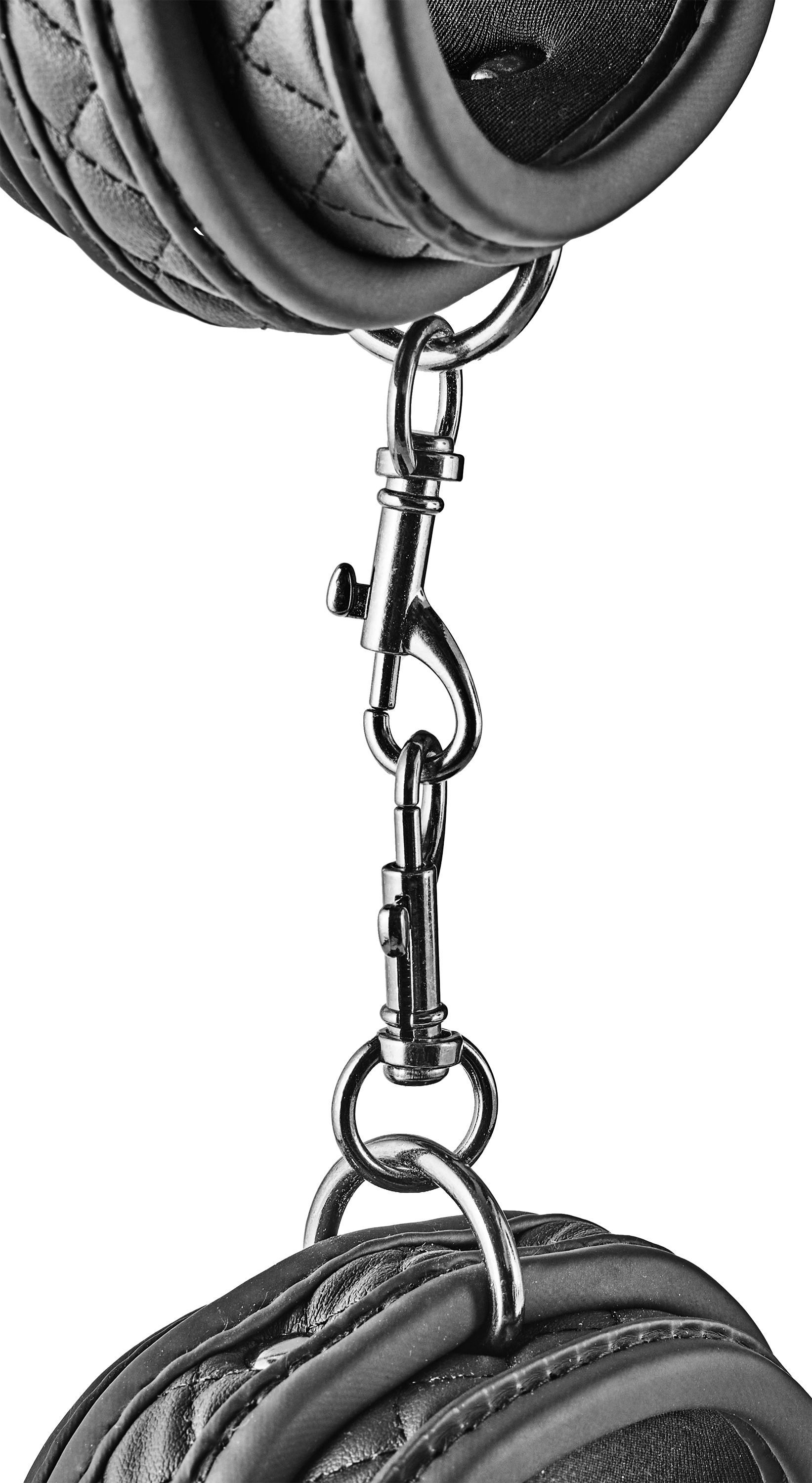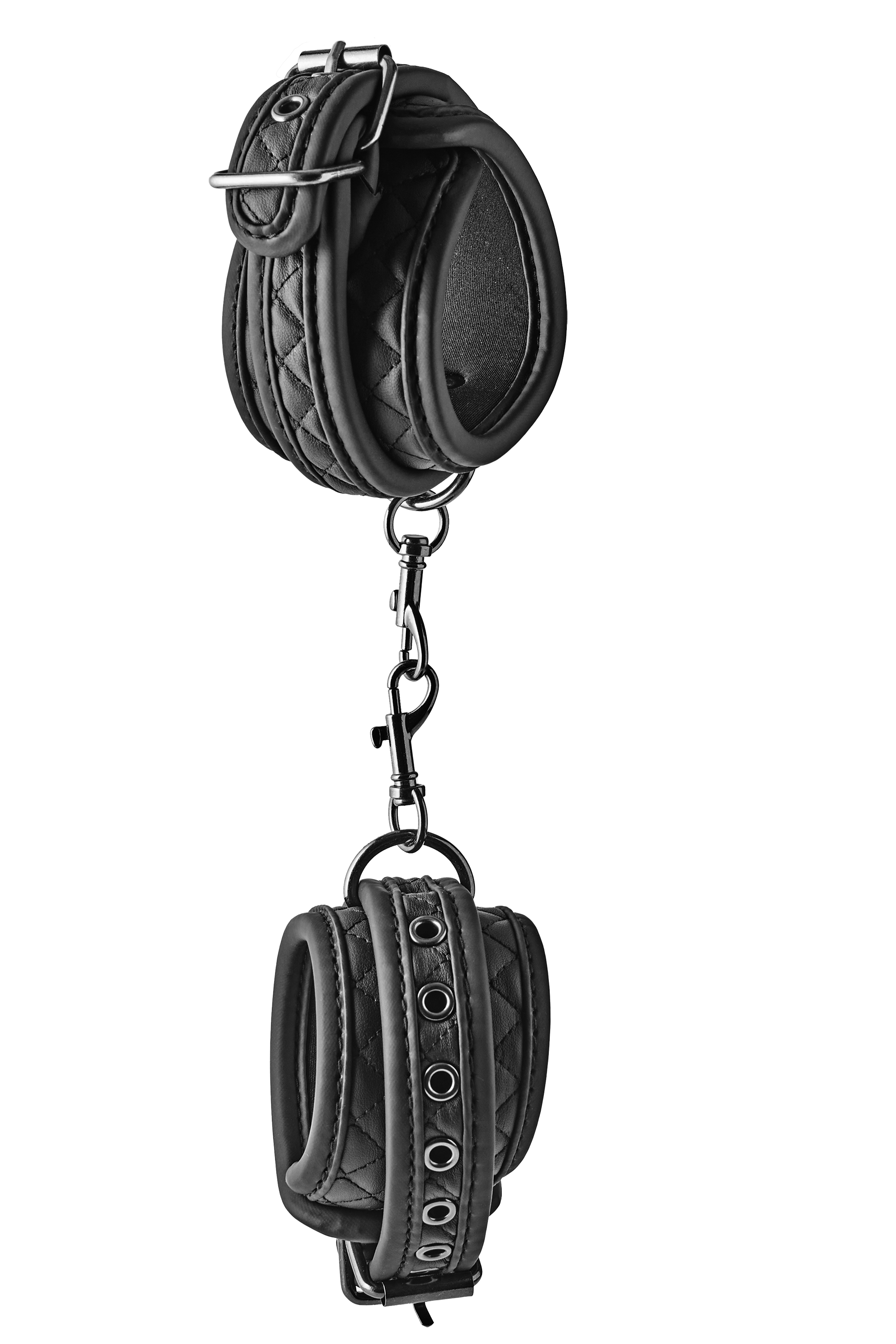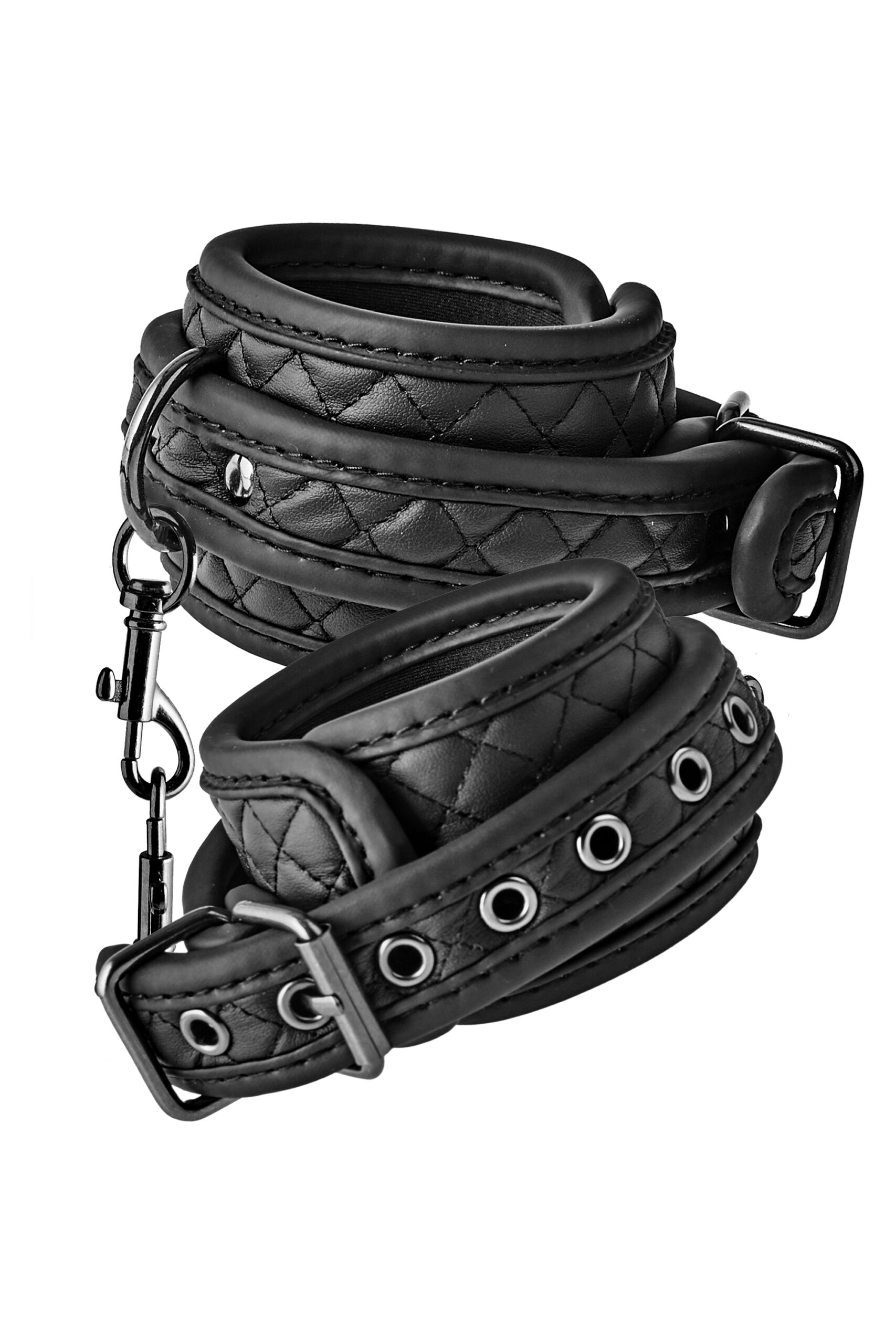 This pair of ankle cuffs from the Blaze collection of bondage products has a black diamond-stitch padded design in vegan leather, with black nickel free hardware. For wearing comfort the cuffs are lined with a soft yet durable neoprene. Ankle cuffs are great accessories for every bondage lover and popular choices among beginners.