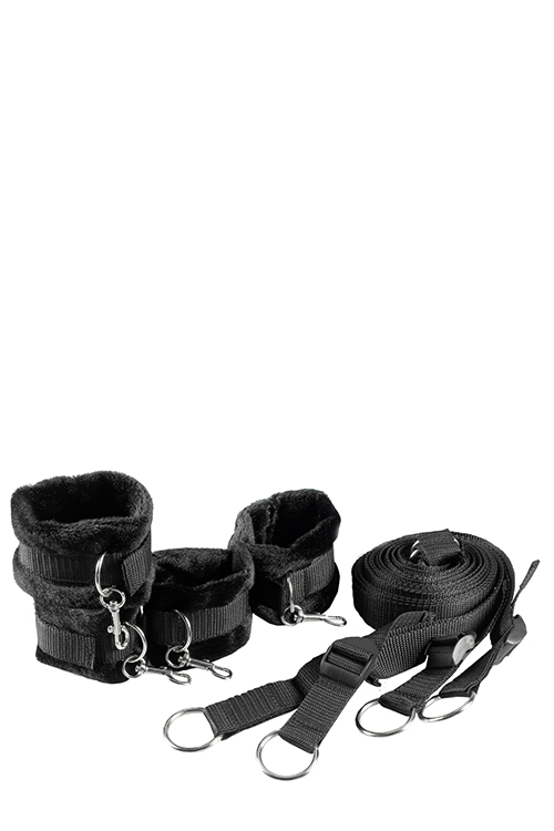 A bed restraint set with wrist and ankle cuffs. Simply slide the straps under the bottom of your mattress either from top to bottom side or side to side to customize your bondage play. The straps can be adjusted to the size of the bed with the plastic buckles. The cuffs are made of fake fur, soft and fluffy, and comfortable to wear, with Velcro closures. They attach to the O-rings of the bed straps with convenient musketon hooks. A restraint set is a great BDSM tool, but use it with care and never leave a bound person unattended.