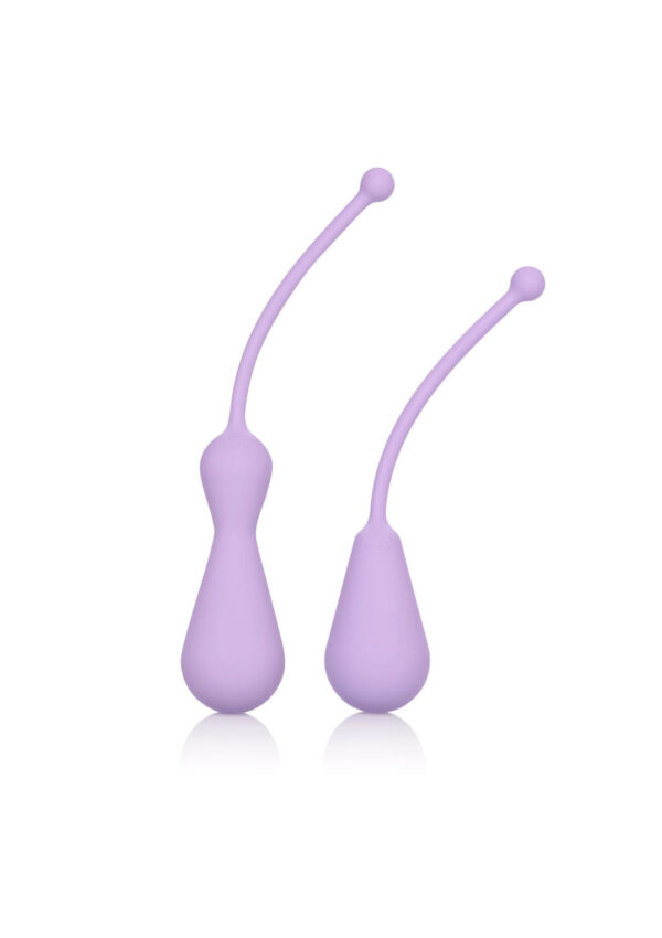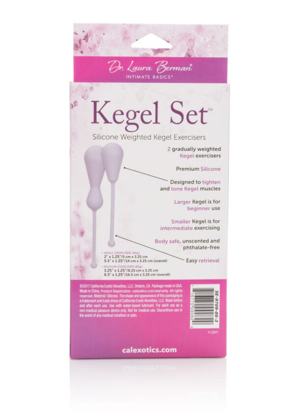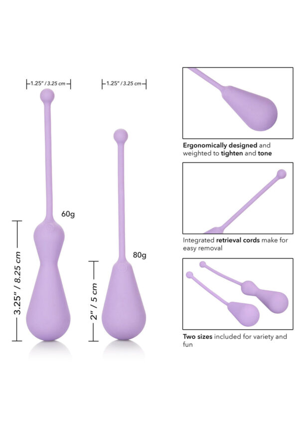 Revitalize and strengthen pelvic floor muscles with the contoured Dr Laura Berman Silicone Kegel Weighted Training Kit. The uniquely designed 2-piece kegel training kit are gradually weighted to gently increase exercise intensity. The premium silicone kegel weights assist to train and tone kegel muscles, increasing sexual satisfaction, sensual stimulation, and pelvic floor strength with every use. The graduated set has been created to tone and tighten kegel muscles over time. The larger kegel is for beginner use, while the smaller kegel weight is ideal for more advanced training. Each trainer is equipped with a durable, flexible retrieval cord to allow for gentle insertion and removal. The large exerciser measures 3.25” x 1.25” and weighs 60 g and the small exerciser measures 2” x 1.25” and weights 80 g. The hypoallergenic premium silicone is body safe, unscented and phthalate free to keep you most sensitive spots, happy and healthy.