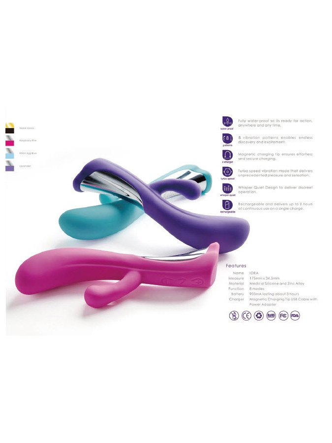 DORR – Iora – Rabbit Vibrator – Turquoise Iora is a dual action rabbit vibrator for intensive stimulation. The rabbit vibrator provides the user with 8 vibration settings, each setting brings you the personal immersive stimulation any time you choose its turbo speed. The toy is rechargeable with a magnetic charging tip and is whisper quiet to deliver discreet use. Iora is fully waterproof and therefore ready for action anywhere, anytime. 8 vibration patterns 1 turbo speed vibration mode  Whisper quiet for discreet use Magnetic charging tip Charging time: 120 minutesUser time: 180 minutes For more information, check the video: VIDEO
