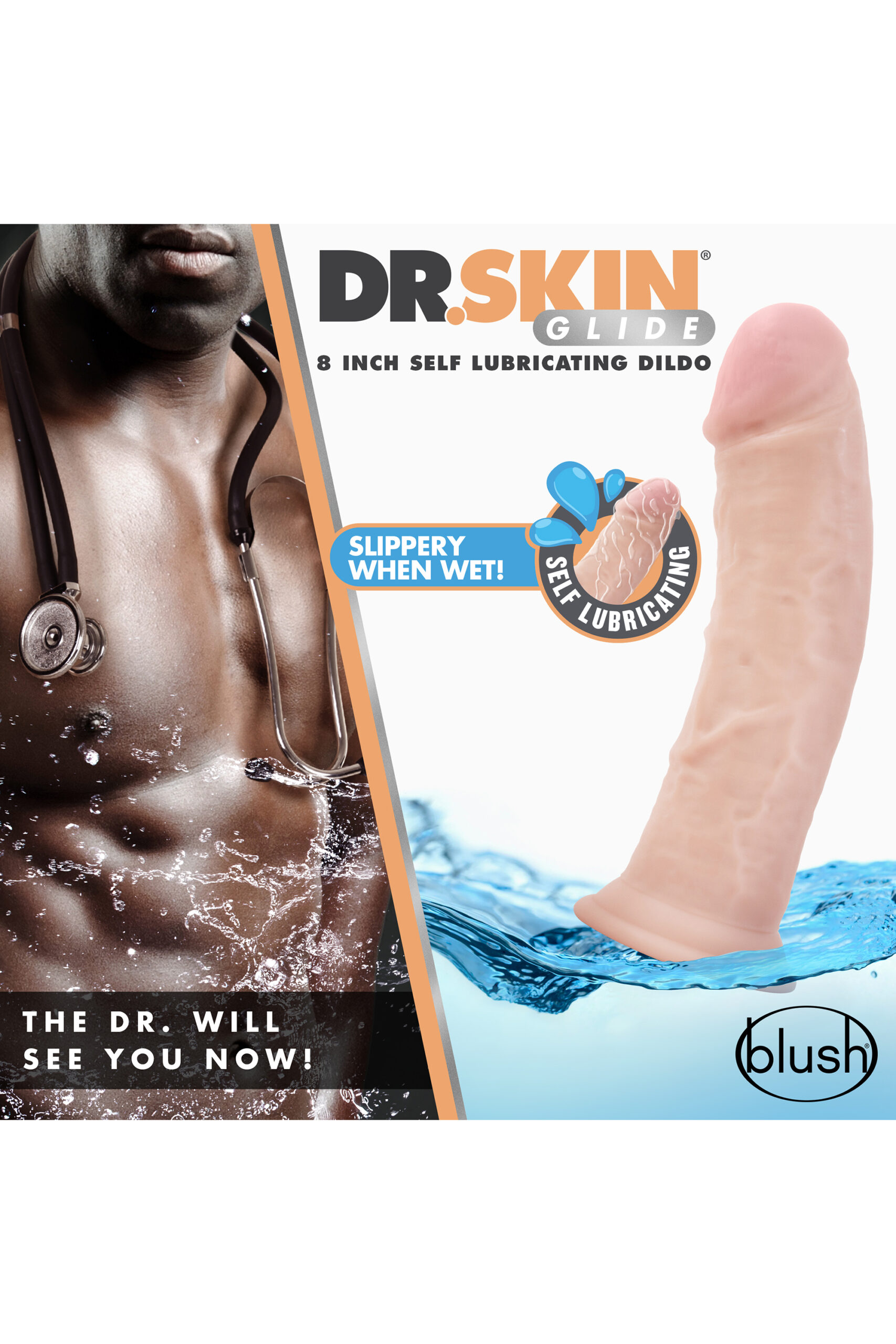 The doctor is in! The Dr. Skin Glide 8 Inch Self Lubricating Dildo is a realistic, self lubricating toy that only needs a bit of water to get slippery! The Dr. Skin Glide has a sturdy suction cup base that will hold to any flat surface and is harness compatible. Made from body safe TPE, this toy contains no fragrances, phthalates, paraffins, or latex. Self lubricating properties are temporary. It will last up to 12 uses. To clean, wash with soap and water. Pat dry and allow to air dry before storing. Use product only with water based lubricants. It is recommended to start using water based lubricants after self lubricating properties begin to diminish.