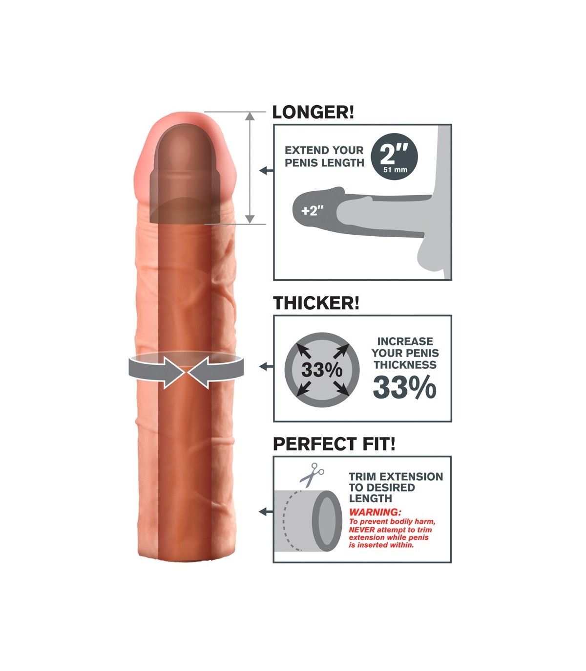 Turn your penis into an instant pleasure machine with the incredible Fantasy X-tensions®. Now you can be as much of a man as you can be and satisfy your partner with this easy-to-use erection enhancer. Developed as a safe, affordable, non-surgical alternative to expensive medical procedures and pills, Fantasy X-tension® will give you the biggest, thickest, most satisfying pleasure rod you’ve ever imagined! Perfect for men with erectile dysfunction and mid-performance issues, your new enhancer will deliver results you’ll both love! The Perfect 2″ Extension is a customizable extension that can be easily trimmed at the base for the perfect fit. It’s super stretchy to fit most sizes and comfortable enough to help you last longer. Your partner will enjoy deeper penetration with the 2″ extension at the tip, while the ultra-realistic shaft makes you 33% thicker all around. The soft Fanta Flesh® material feels like a second skin, giving you the length, girth, and confidence you need to satisfy your lover. • 2 in. (51 mm) extension • Adds 33% girth • Ultra-realistic Fanta Flesh® • Trimmable for a perfect fit