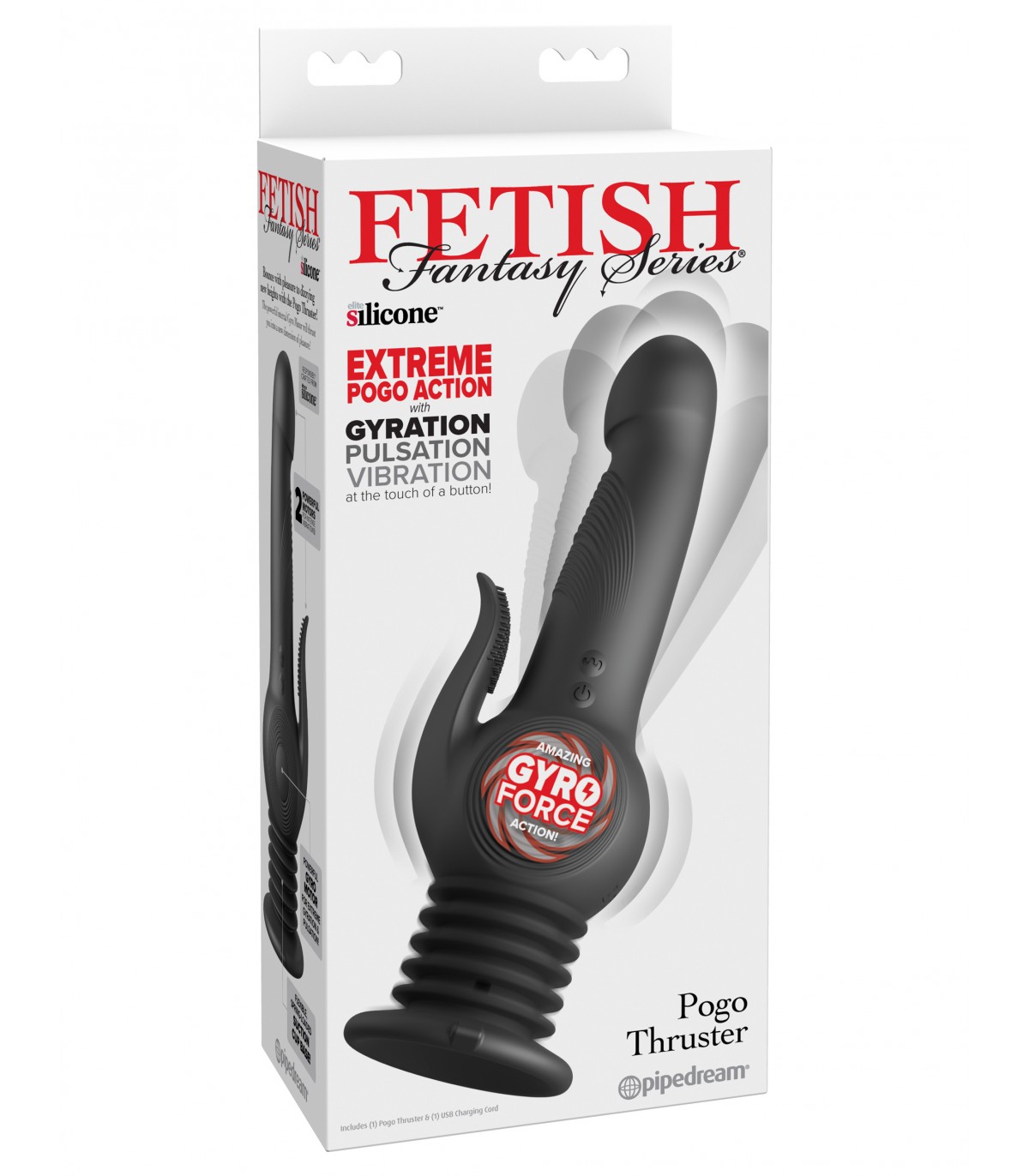 Get ready for the wildest ride of your life with our new Fetish Fantasy Series Pogo Thruster, our latest revolutionary vibrator that features an internal gyroscopic motor that generates 3 speeds of powerful, relentless vibrations, pulsations and gyrating action. This is intensified by a flexible spring-loaded suction cup base, which delivers rhythmic and dynamic “pogo” actions that will have you bouncing to the edge of ecstasy. Plus, two powerful vibrating motors—one in the head and one in the flickering textured tongue—raise pleasure to new heights with 10 mind-blowing vibration patterns. This unique combination of features makes the Pogo Thruster a must-have in your pleasure chest. Crafted from ultra-hygienic Elite Silicone, a sensual ridged shaft and tiny ticklers on the vibrating tongue take your orgasms to the next level. Use the flexible suction cup base on almost any clean, flat surface for a thrilling hands-free thrusting ride! Explore endless possibilities of pleasure with your own combinations of speeds and vibration patterns for an orgasmic experience that will captivate you, whether playing alone or with a partner. Features and benefits • Ultra-powerful gyroscopic motor • 3 intense speeds of pulsation and rotation • 2 powerful motors in the head and tongue • Flexible spring-loaded suction cup base • Elite silicone material • Rechargeable: includes charging cable