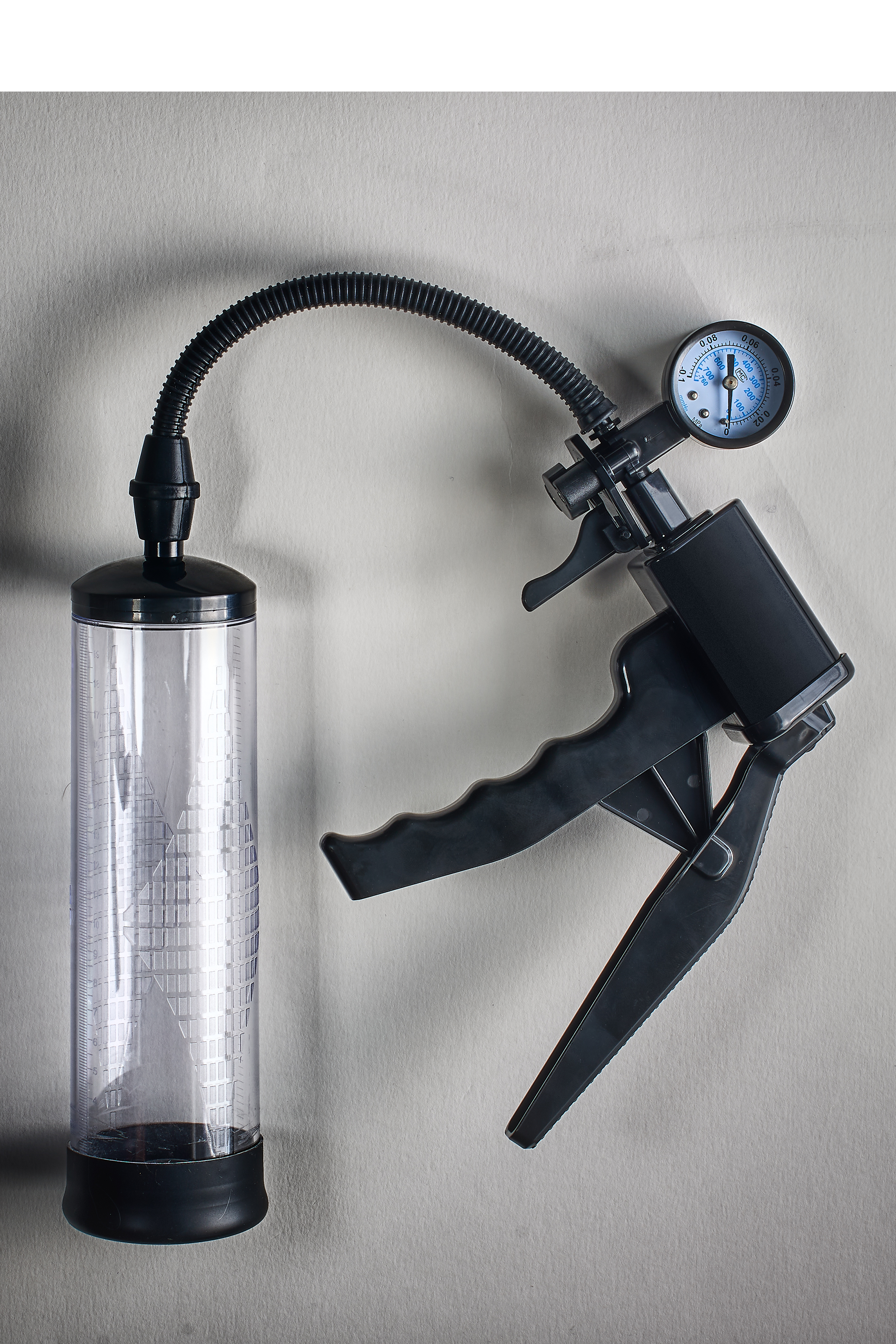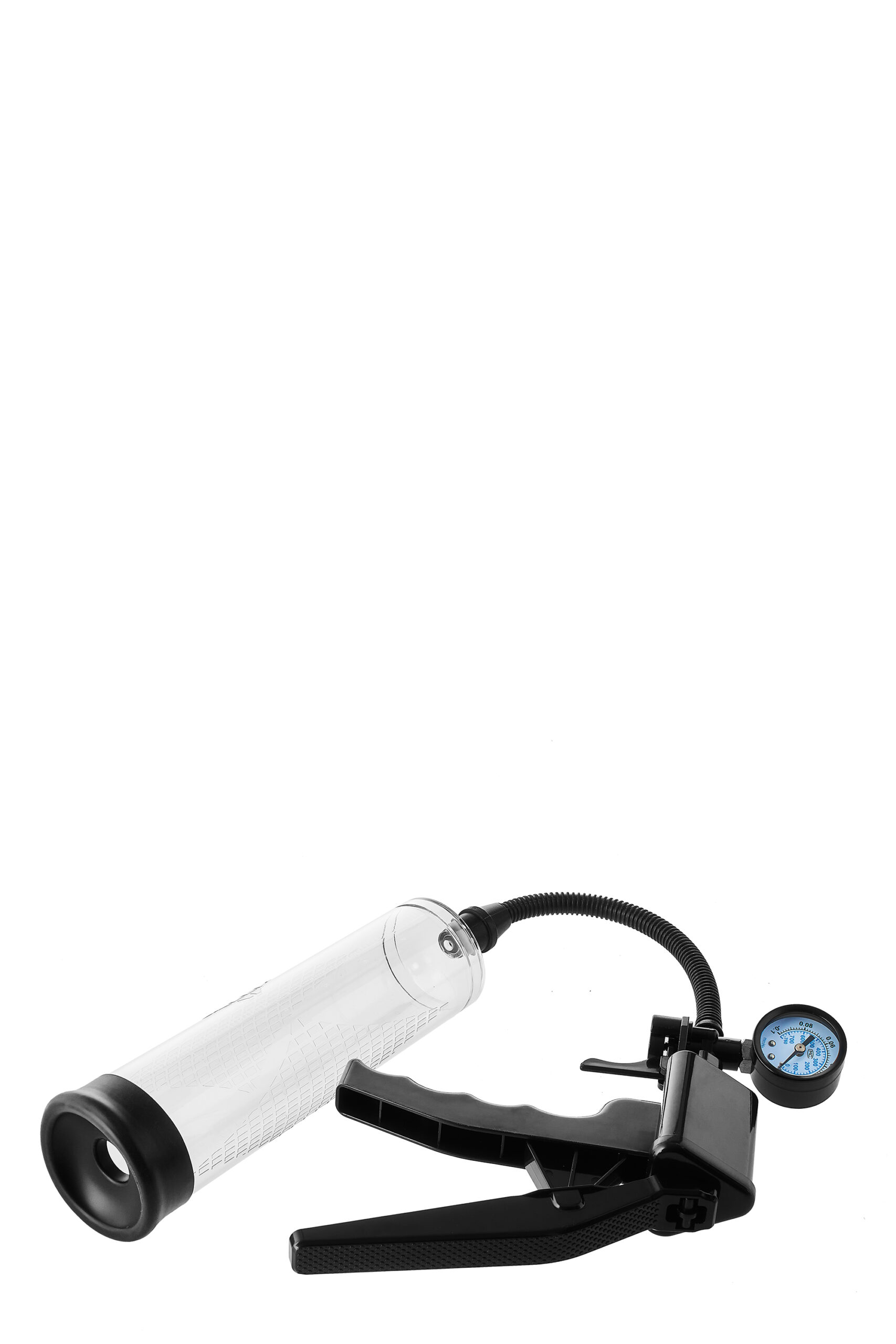 Improve your erection and performance with this Deluxe Penis Pump & Masturbator with pressure meter. The vacuum also helps to get and maintain an erection in case of erectile dysfunction. Manual operation with the pistol trigger that has a quick release valve. Transparent cylinder with size marks. With the extra sleeve the pump can be used as a masturbator. Including penis ring..