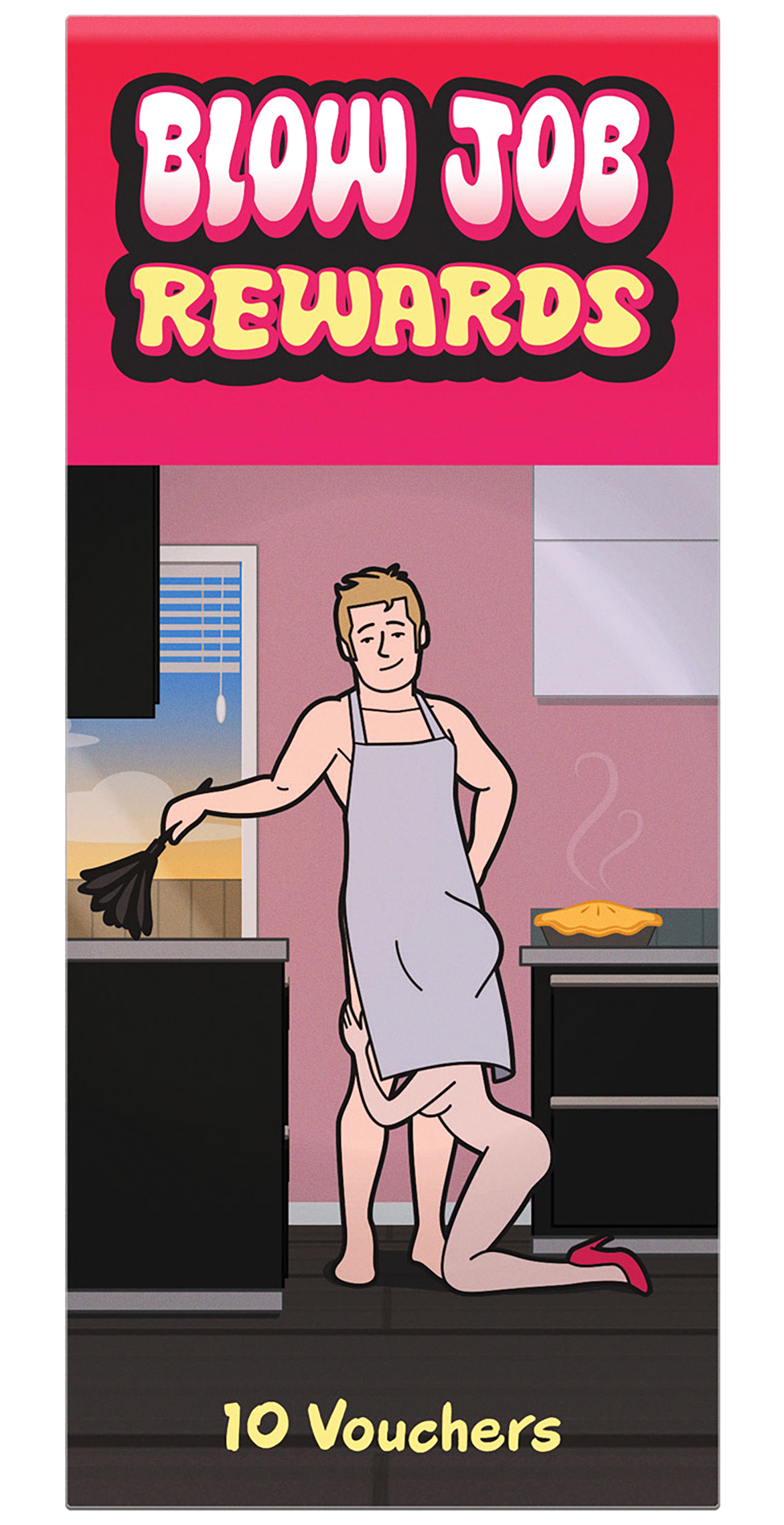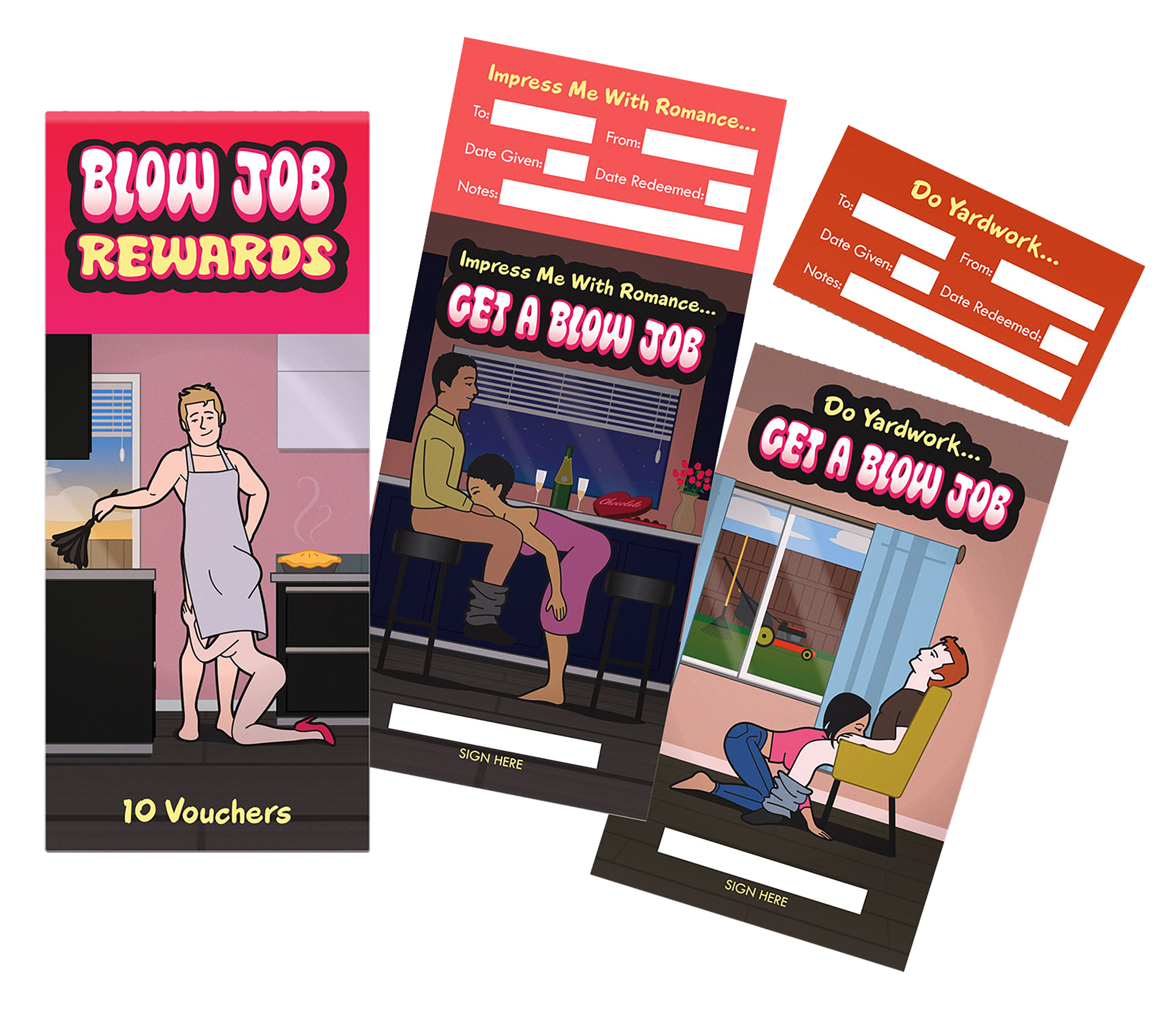 “Blow Job Rewards” è un set di coupon divertenti e stravaganti che una donna può dare al proprio fidanzato o marito per convincerlo a dare una mano in casa. Alcuni esempi includono “Lava i piatti, fatti un pompino” e “Ripara qualcosa / QUALSIASI cosa, fatti un pompino”. Ce ne sono 10 in totale e le illustrazioni sono sexy e divertenti. Anche le sue esigenze non vengono dimenticate, e il set si conclude con un premio “Concentrati su di me e vedremo”.