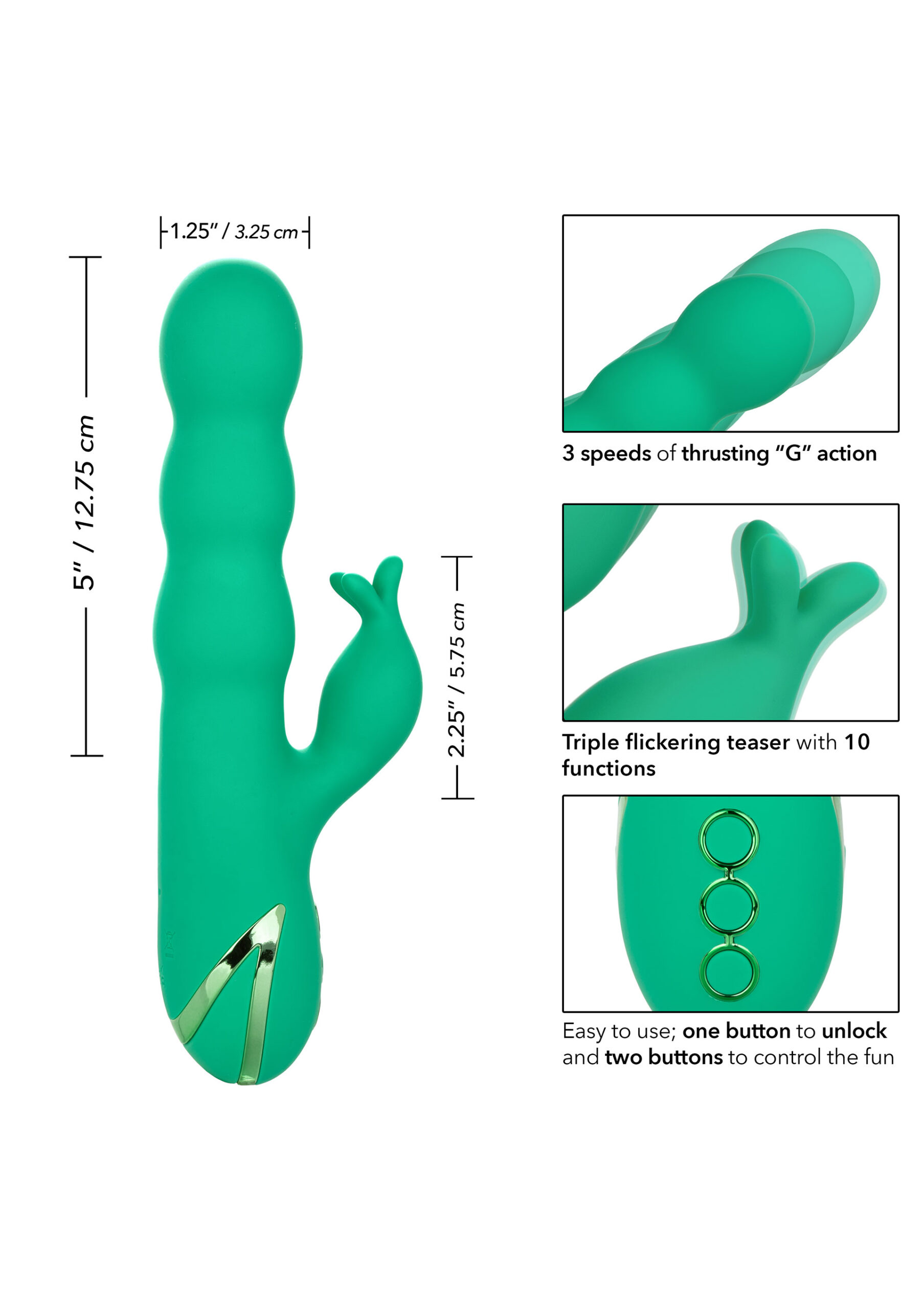The playful California Dreaming Collection brings luxurious fantasies to life with the orgasmic Sonoma Satisfier. The powerful massager is ready to relive your favorite summer fling fantasies with 10 powerful functions of vibration and 3 knee-shaking thrusting speeds. While the flickering stimulator teases, the BEDDED shaft and rounded tip delivers a deep thrusting, g-spot stimulation. The curved tip has a powerful thrusting action to make sure you always hit the right spot. The teasing triple tickler uses a powerful vibration motor to deliver blissful external stimulation. The flexible teaser can be used independently from the thrust function for fully customizable pleasure. The knee-shaking gyrations packed into this playful vibe aren’t for the faint of heart! Triple power motors put out deep rumbling vibrations and powerful suction. Plug the provided USB cable into the self-healing charging port to recharge your passion in 2.5 hours. Thrill with up to 90 minutes of vibrating pleasure. To effortlessly control stimulation, the sleek 3-button control pad lets you independently operate the vibration and thrusting options. The high-tech memory chip remembers just how you like it resumes play on the last function used.