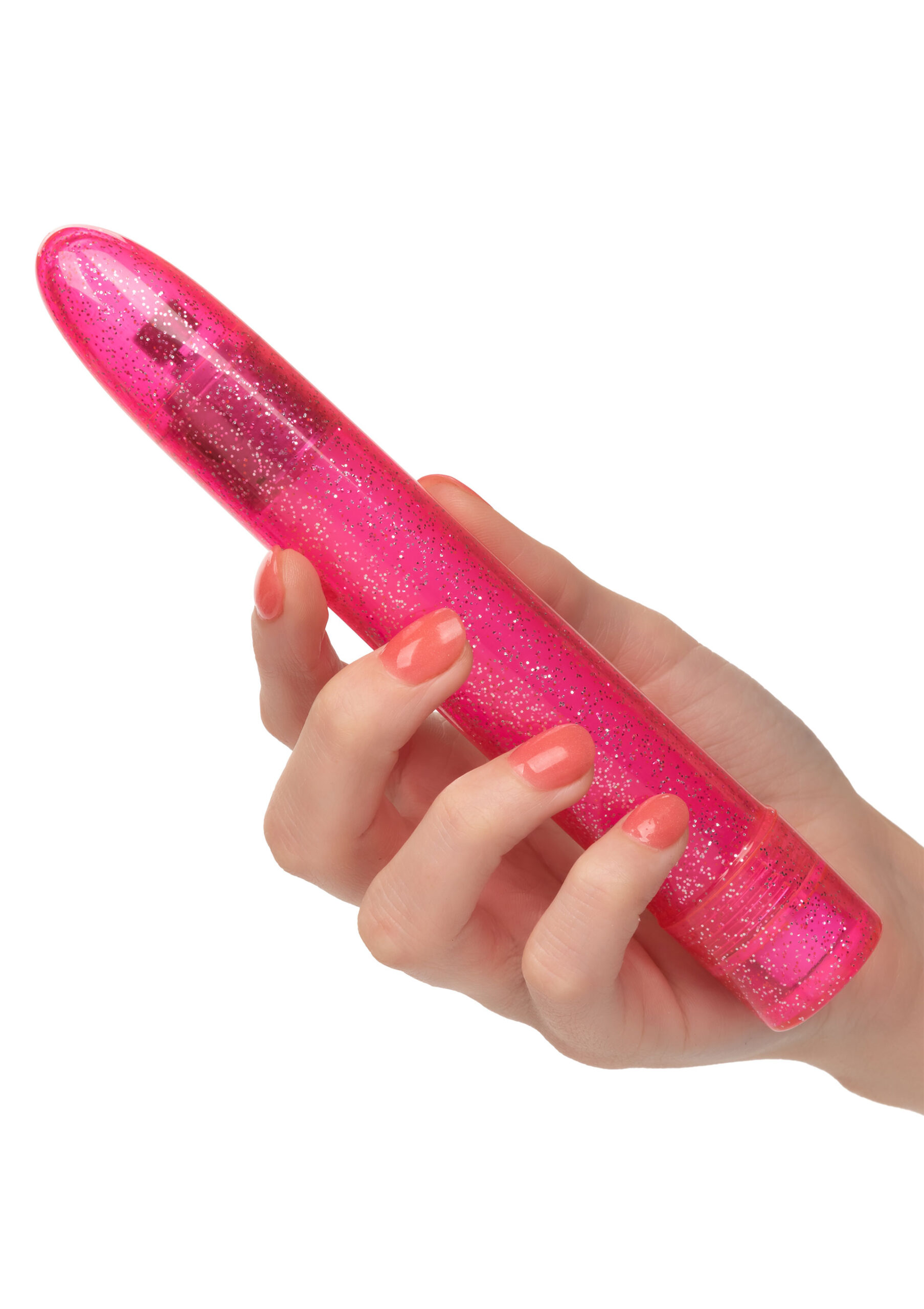 Indulge in dazzling pleasure with the Sparkle Slim Vibe, a sleek massager and 3 speeds of vibration. With an easy-to-use button and waterproof design, this is an erotic toy box must-have for beginners and erotic adventurers alike. This high-powered massager is created with a sleek, seamless body and gently curved tip to let you effortlessly control stimulation. Whether you’re taking a dip with a lover or indulging in a steamy solo session, alluring adventure await you with this dazzling vibrator. Plunge into total ecstasy as this orgasmic vibe rubs, tickles and teases. The playful vibe is made from a smooth ABS plastic with sparkly glitter finish and silicone button. Power up your pleasure with 2 AA battery.
