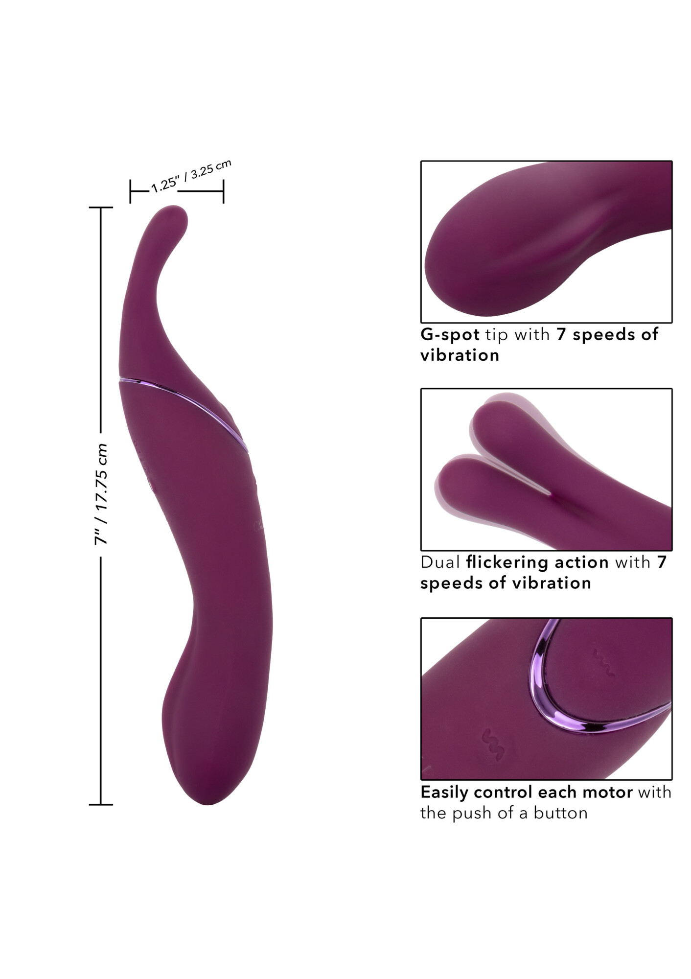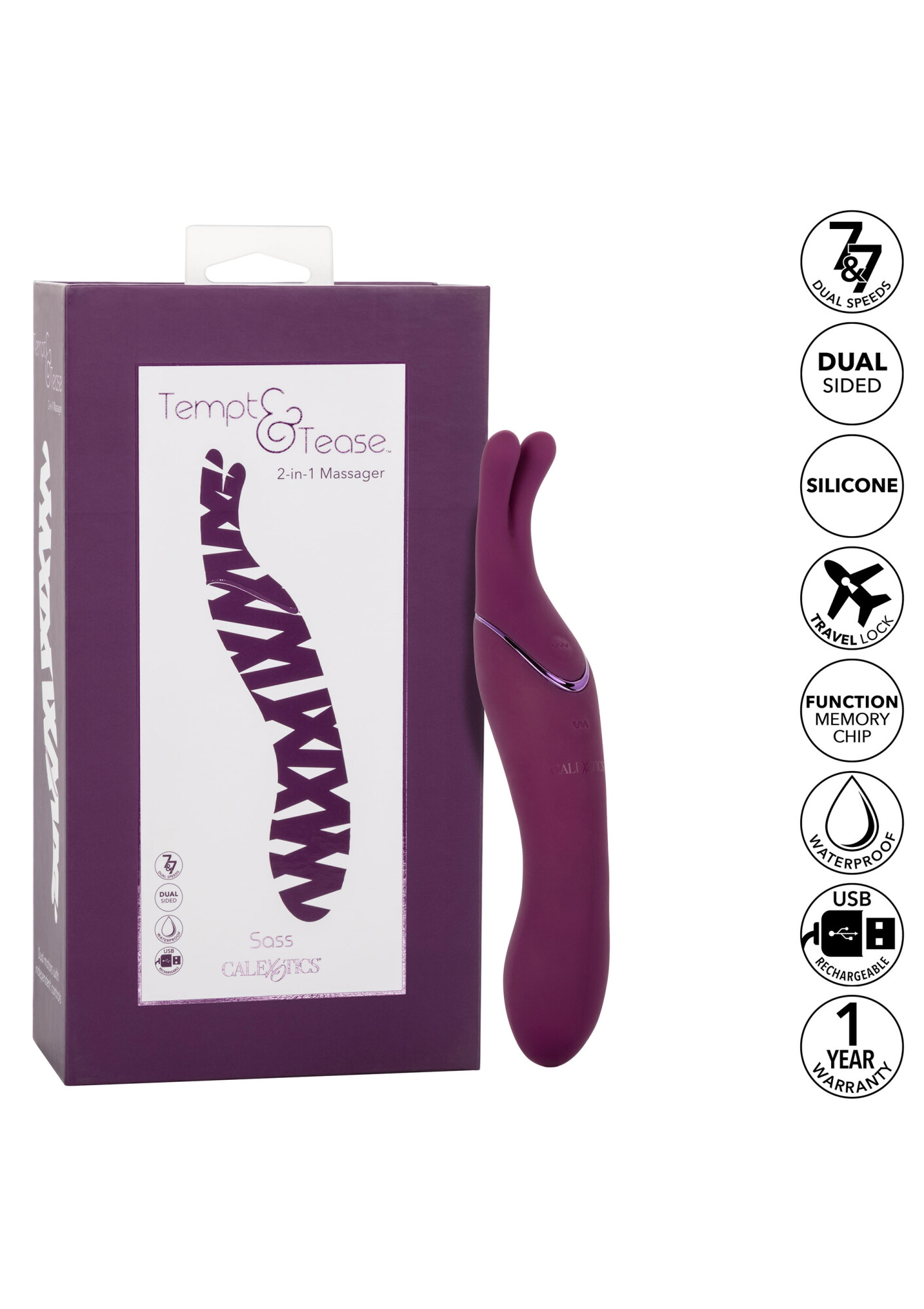 The Tempt and Tease Sass is a dual sided massager that knows exactly what you’re craving. Feel the heat rise with the dual ended massager with two distinctive ends, two powerful motors, and 7 independently controlled vibration functions. With a versatile shape and two powerful vibration motors in each end, you’ll be reaching new climactic heights in no time. Tickle and tease externally using the flickering teasers with long fluttering tip, or dive deep into rumbling internal stimulation with the curved G side. Choose your style of pleasure with two independently controlled motors in each end of this dual-sided massager and you will never get tired of this sexy stimulator.